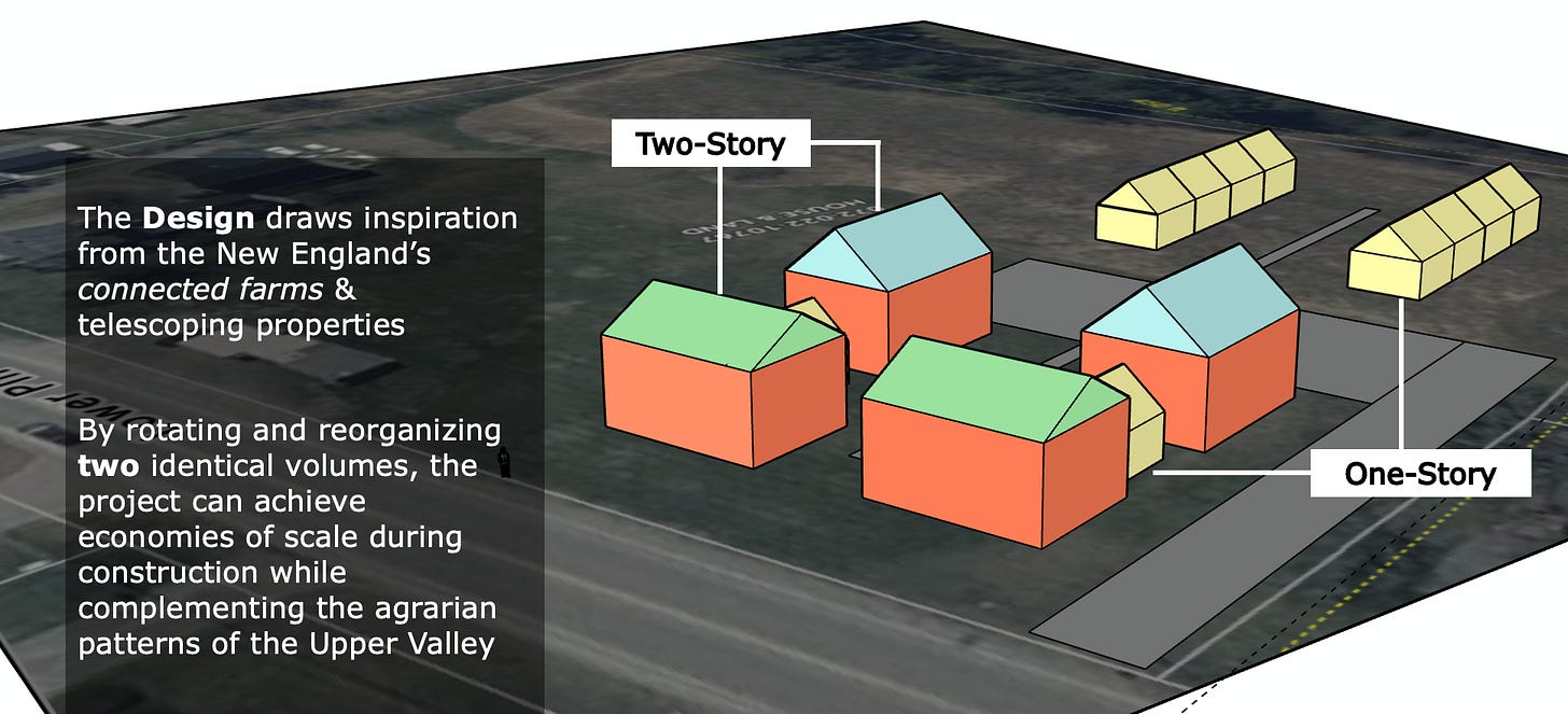 Design language: Upper Valley agrarian, standardized and panelized to reduce hard costs.